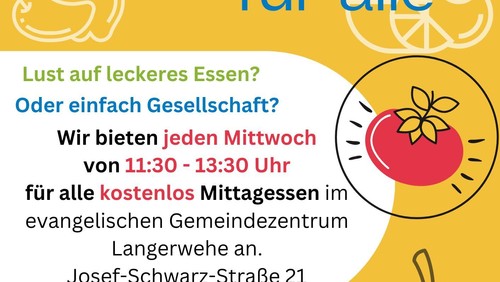 Jeden Mittwoch laden wir alle Menschen ganz herzlich zum "Mittagessen für ALLE" in unser Gemeindezentrum in Langerwehe ein.